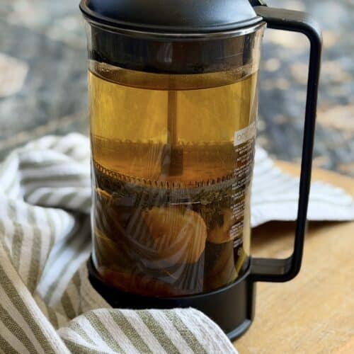 When I wake in the morning, around 6 AM, I go downstairs to make breakfast and pack lunches for my family. However, one of the first things I do is fill my electric tea kettle with water. Then, I add the fruit scraps from packing lunches, like apple cores and citrus rinds, to the bottom of my French press. Once I add the fruit leaves to the French press, top it full of hot water from the tea kettle, and let it steep all morning long.